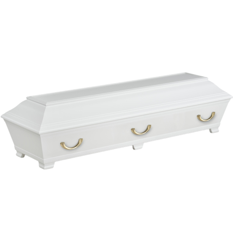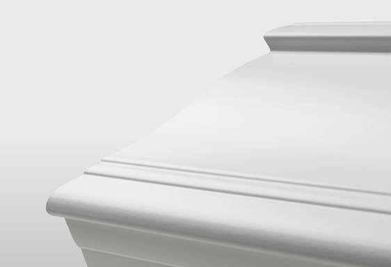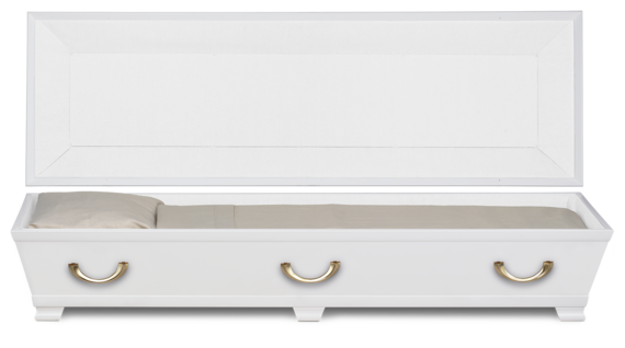 Elegant kista som är lackad i vit, svart eller valfri NCS-färg. Inredning bestående av av kudde och täcke med överlakansflik i linnekvalitet. Madrass i nonwoven-textil. Lock- och sidoklädsel i bomullstyg. I inredningsbilden används lockstöd.