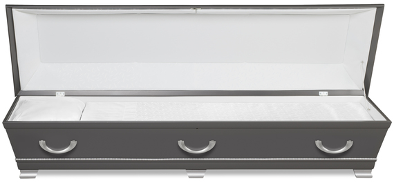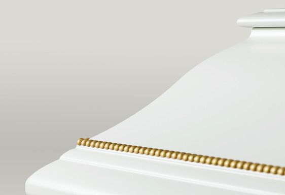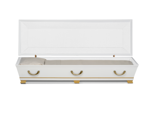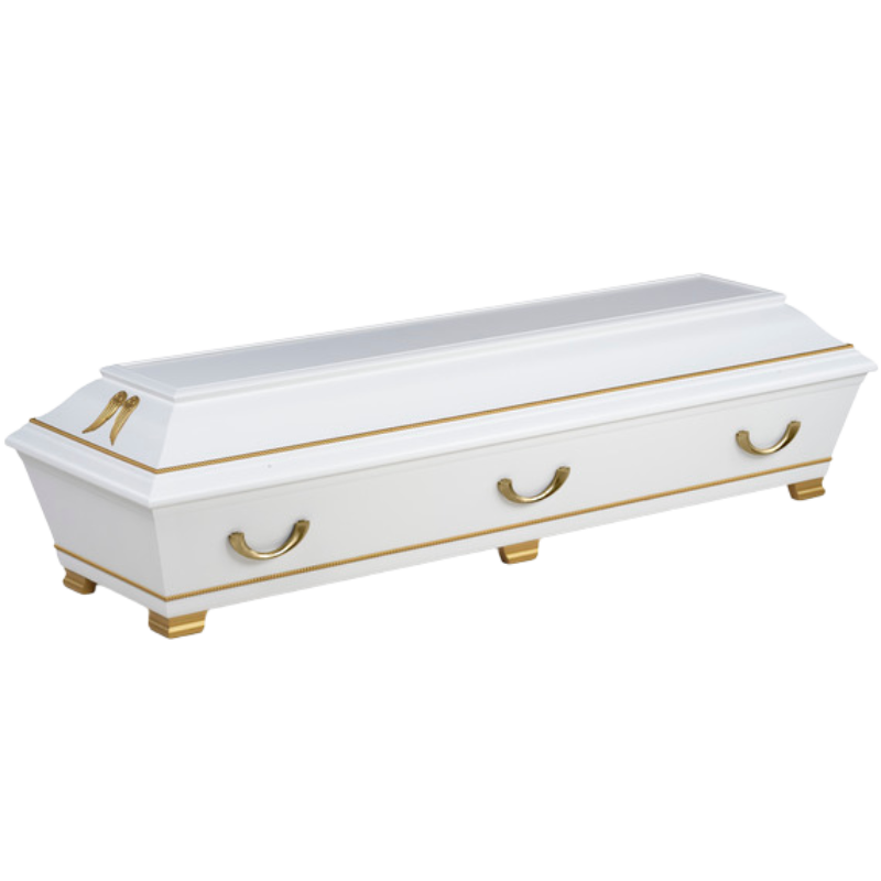 Elegant vitlackad kista med löstagbara änglavingar och vacker gulddekor på lock och botten. Inredning bestående av av kudde och täcke med överlakansflik i linnekvalitet. Madrass i nonwoven-textil. Lock- och sidoklädsel i bomullstyg.
