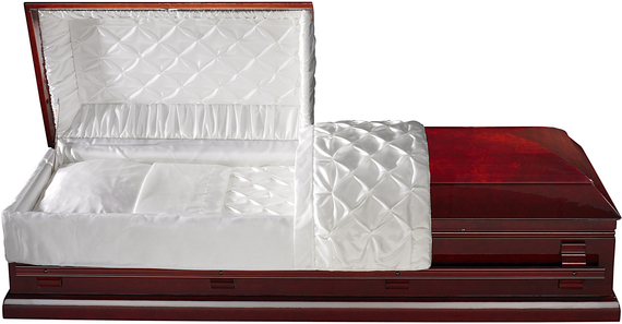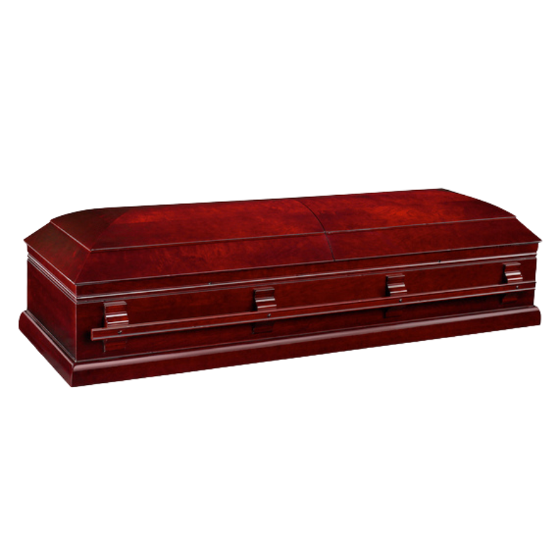 Massiv kista av högsta kvalitet i lackat och mahognybetsat körsbärsträ. Kistan vilar på en kraftig sockel istället för på fötter. Bärstång av trä. Tvådelat lock och nyckellås. Draperad tyginredning i locket, madrass, underlakan, noppat täcke med överlakansflik och kudde.