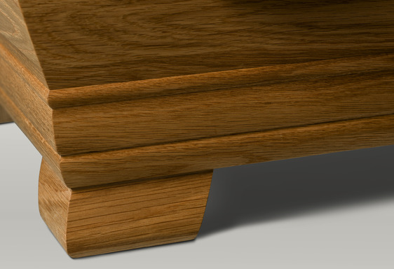Förstklassigt hantverk i massiv ek med trähandtag, gångjärn och nyckellås. Går att få som oljad ek. Tyginredning i form av madrass, kudde och täcke med överlakansflik i bomull. Stilrena detaljinslag i täcket. Tyginrett lock och sidoklädsel.