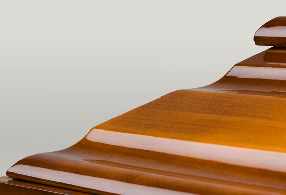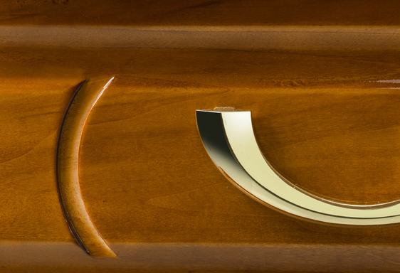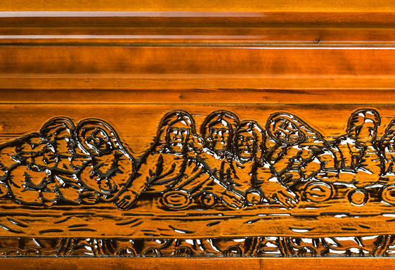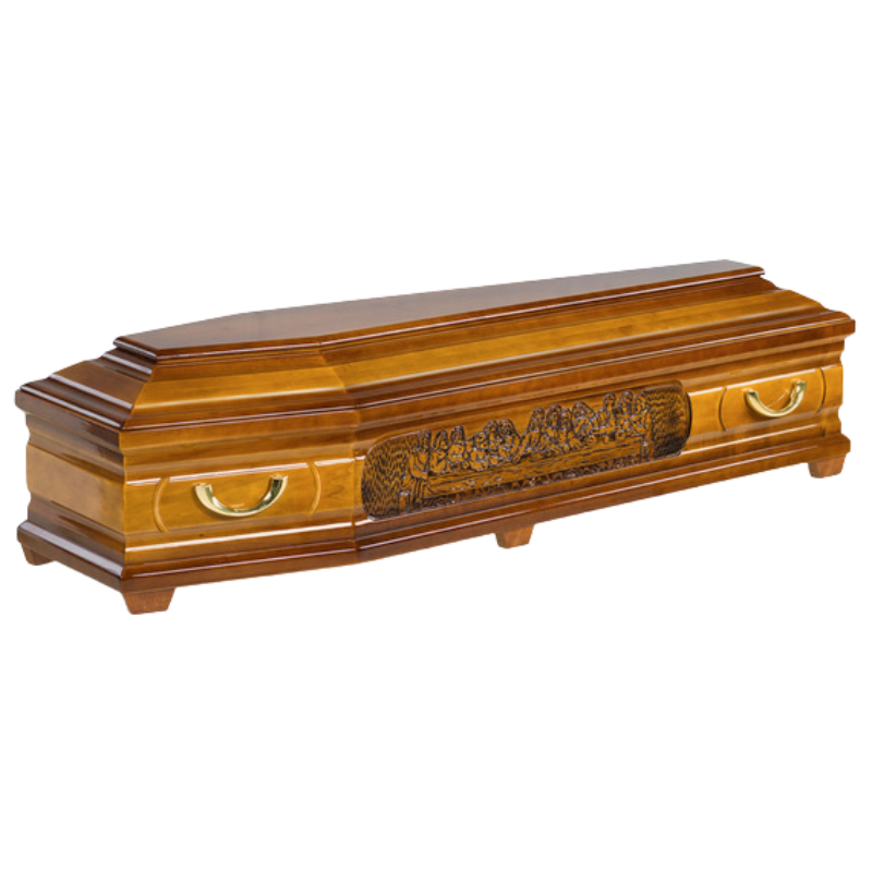 Kista i Poppel med utfräst motiv av Jesu sista måltid. Arbetad kista med vackra detaljer och eleganta guldfärgade metallhandtag. Tyginredning i form av madrass, kudde samt klassiskt noppat täcke med överlakansflik i bomull. Oklätt lock.